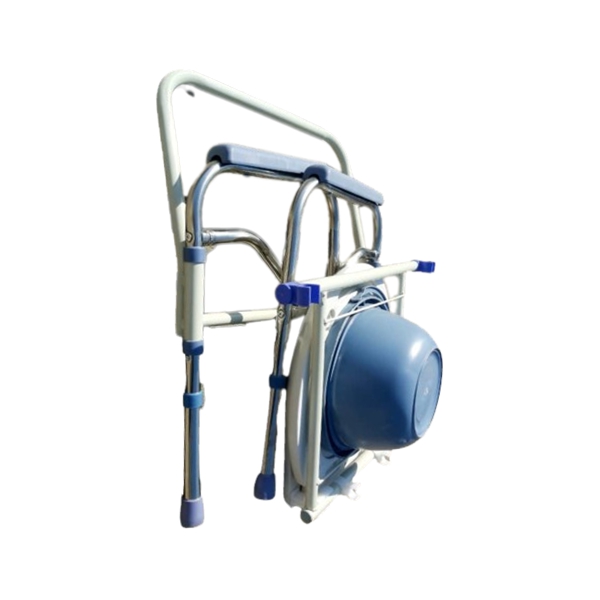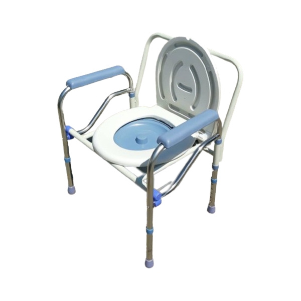 جنس بدنه اصلی صندلی توالت از استیل و نشیمنگاه و تکیه گاه از پوشش رنگ کوره ای است. جا به جایی آسان و دارای دو دسته در طرفین برای کمک گرفتن بیمار در زمان نشستن و بلند شدن و دارای یک پشتی در عقب جهت حفظ تعادل بیمار می باشد. توانایی تحمل وزن بالا را دارد. دارای لگن درب دار گرد قابل تخلیه و قابلیت تنظیم پایه ها از 45 تا 55 سانتیمتر نیز می باشد.