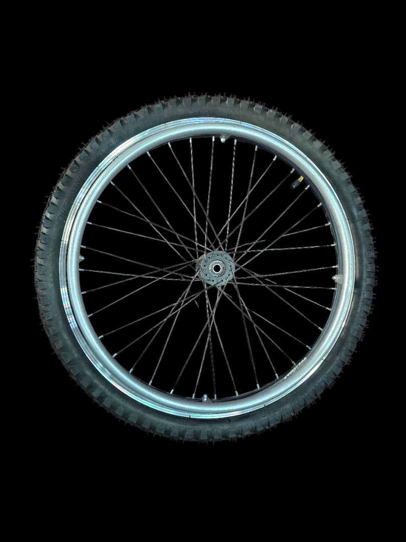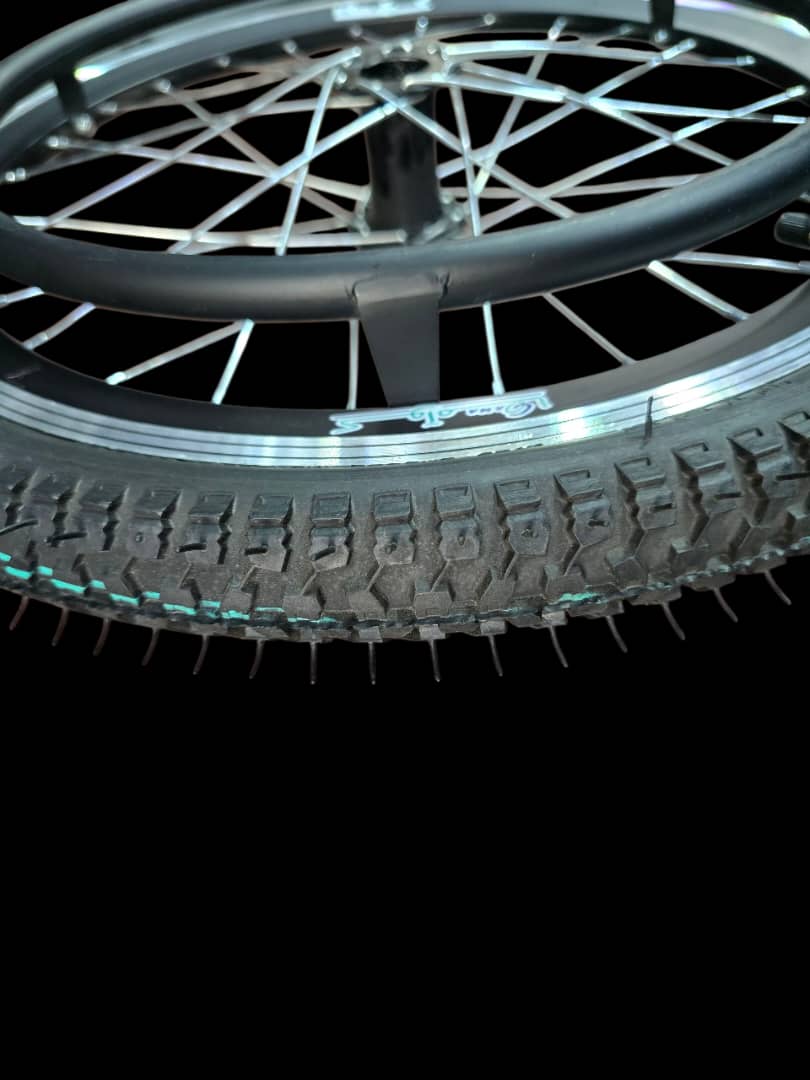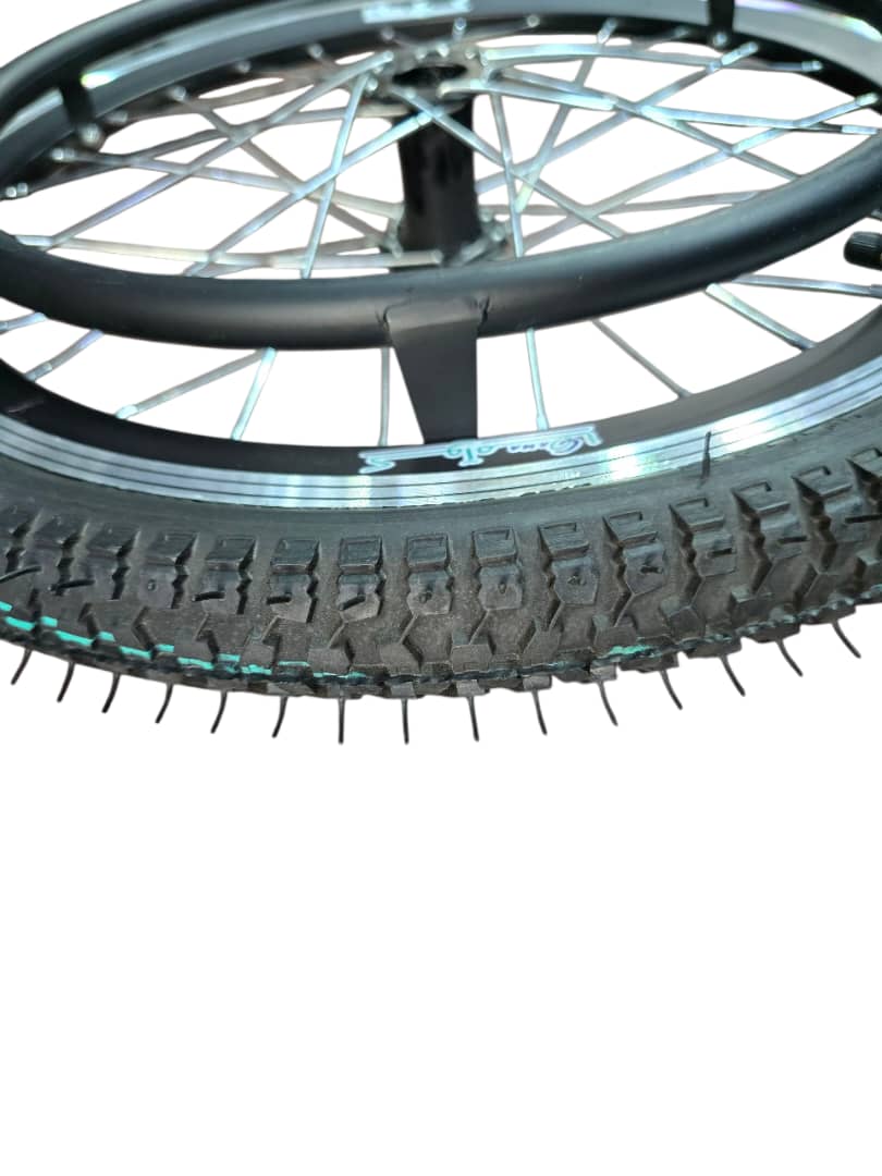 چرخ عقب ویلچر مدل کوآما سایز3/8*1*20/ از جنس لاستیک بادی بسیار مقاوم ونرم،دوام بسیار بالا قابل در تمامی سطوح/رینگ آلومینیوم پره ای با رنگ بندی مختلف/توپی نشکن و مستحکم از جنس پلی آمید الیاف دار و ضدضربه و ضدسایش و ضد خورندگی با استحکام بالا