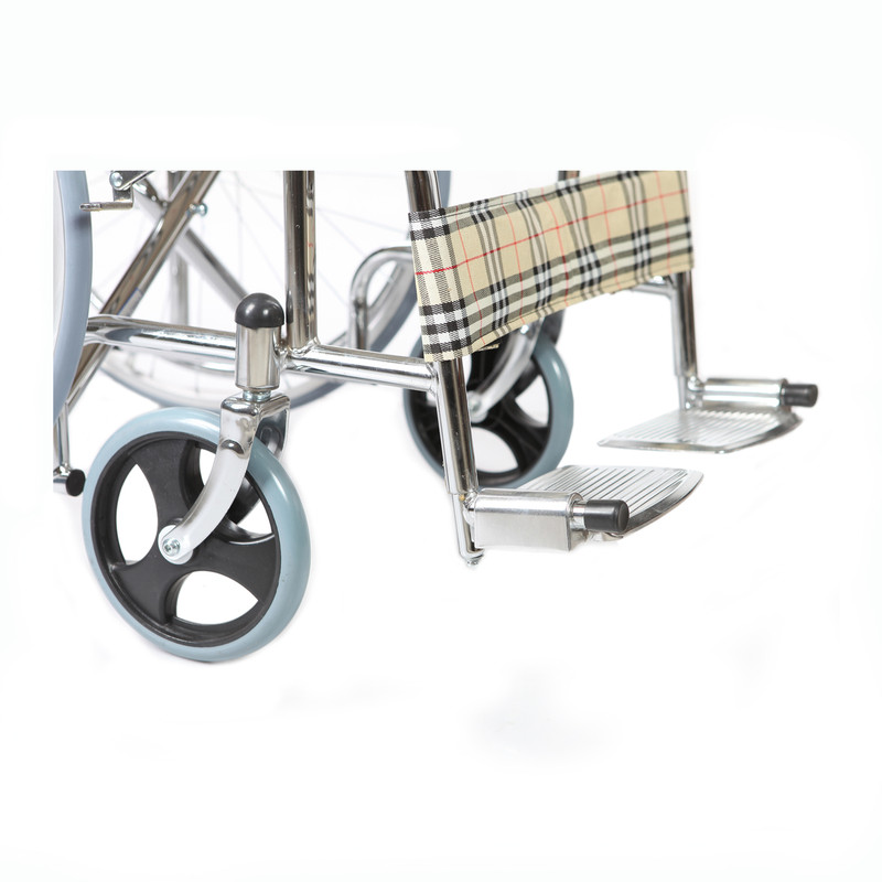 ویلچر تاشو/ بدنه استیل روکش آبکروم/چرخ عقب و جلو توپر/کفی و پشتی برزنتی چهارخونه کرم رنگ/ زیرپایی و زیردستی ثابت