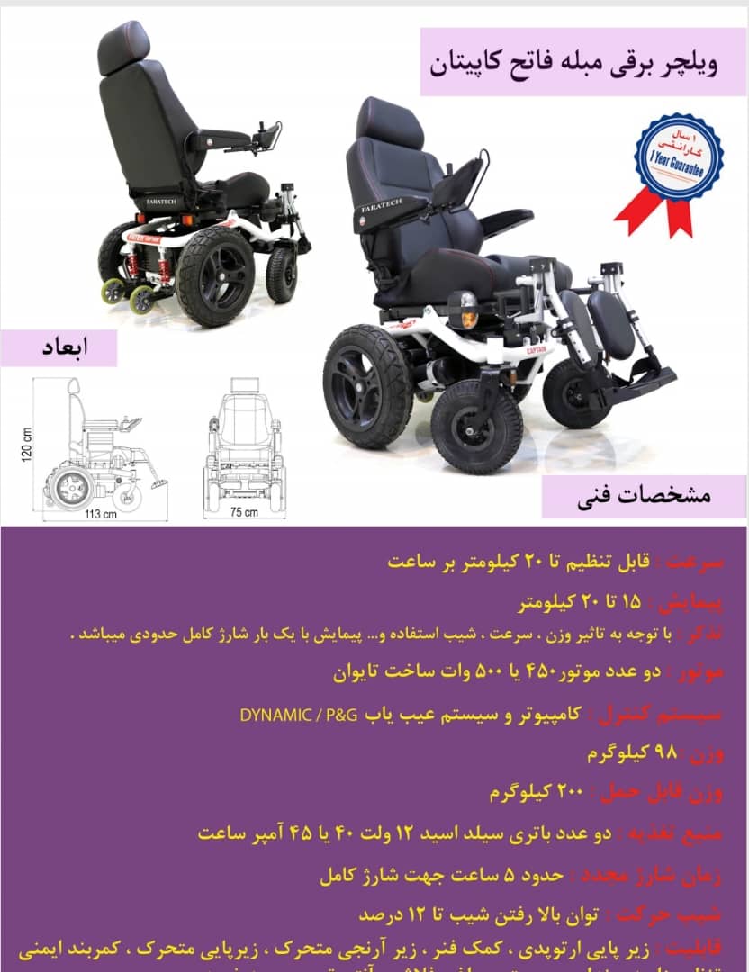 ویژگی های ویلچر برقی فراتک مدل فاتح کاپیتان : این ویلچر برقی به علت داشتن سیستم کنترلی و هدایتی آسان، زیر پایی متحرک و ارتوپدی، قابلیت تنظیم زاویه صندلی، کمک فنرهای قوی انتخابی مناسب برای معلولین می باشد. حداکثر سرعت این ویلچر برقی 18 کیلومتر بر ساعت بوده و حداکثر وزن قابل تحمل آن 150 کیلوگرم میباشد.