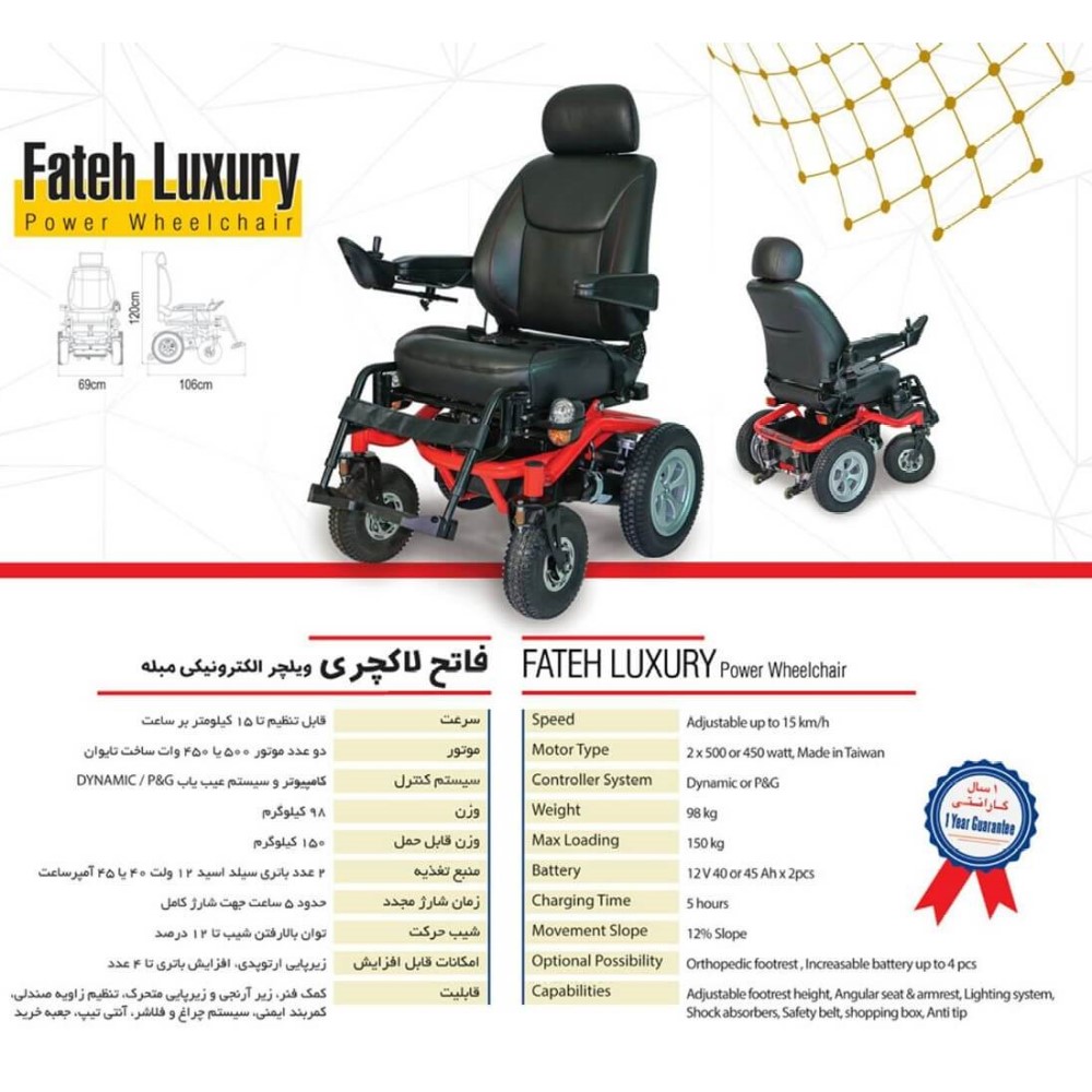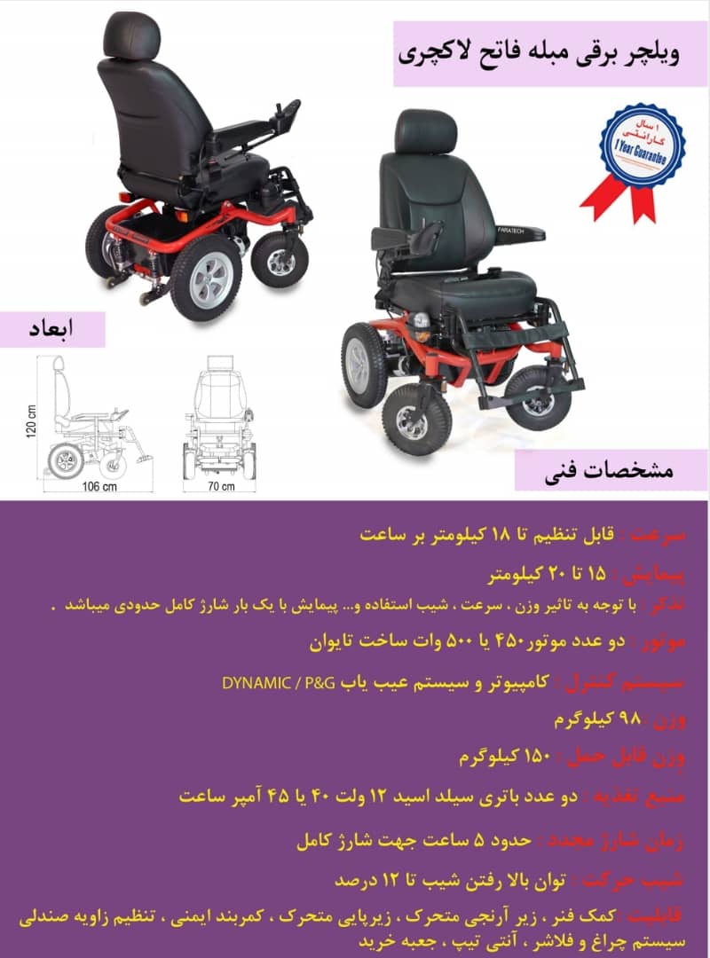 قابلیت : کمک فنر ، زیر آرنجی متحرک ، زیرپایی متحرک ، کمربند ایمنی ، تنظیم زاویه صندلی ، سیستم چراغ و فلاشر ، آنتی تیپ ، جعبه خرید/امکانات قابل افزایش زیرپایی ارتوپدی ،افزایش باتری تا 4 عددسرعت قابل تنظیم تا 15 کیلومتر بر ساعت/موتور دو عدد موتور 450 یا 500 وات ساخت تایوان/سیستم کنترل کامپیوتر و سیستم عیب یاب هوشمند P&G / DYNAMICوزن 98کیلوگرموزن قابل حمل 150 کیلوگرم/منبع تغذیه دو عدد باتری سیلد اسید 12ولت 40 یا 45 آمپر ساعت